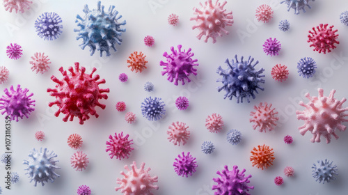 Colorful microscopic virus models on white background, representing illness and infection concept