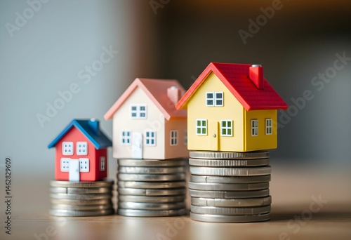 colorful, miniature, toy houses, stacked on top of coins, financial investment, real estate, affordable housing, 3d render, detailed, sharp focus