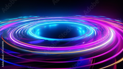 Colorful motion elements illuminated by neon LED lights create an abstract futuristic background, evoking a dynamic and vibrant atmosphere.