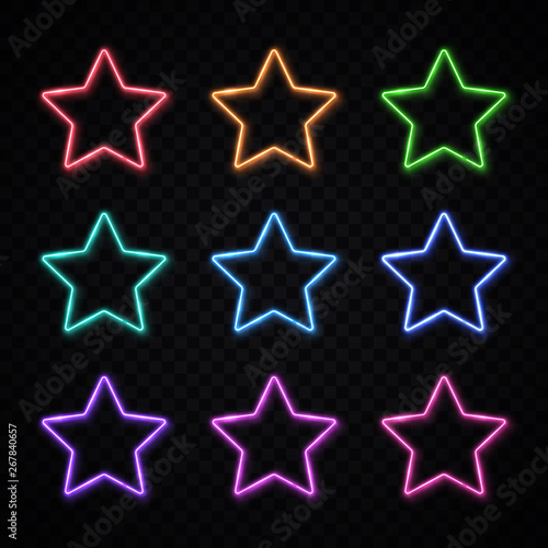 Colorful neon stars set on transparent background. Glowing led lamp technology star shape borders collection. Halogen signs for banner flyer poster design template. Electric frames vector illustration