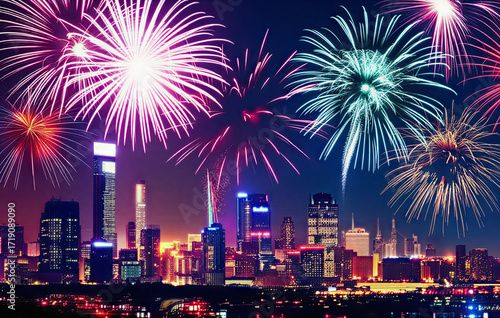 Colorful New Year Fireworks over City Skyline | Cinematic Hyperrealistic Render