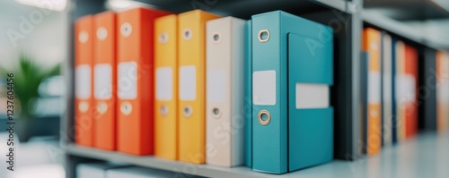 Colorful office binders on a shelf in a modern workspace