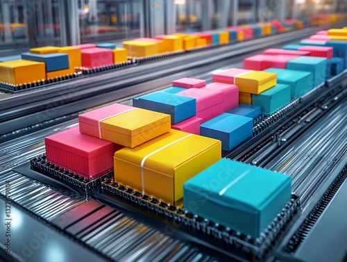 Colorful Packages Moving Along a Conveyor Belt in a Bustling Warehouse During the Daytime