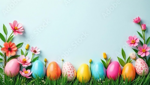 Colorful painted eggs and spring blooms border, background, spring decorations