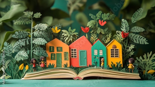 Colorful Paper Houses and Figures on Open Storybook Surrounded by Greenery