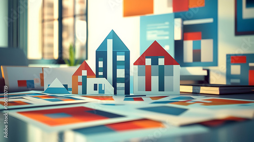 Colorful paper houses on a table with graphs and a computer in the background.