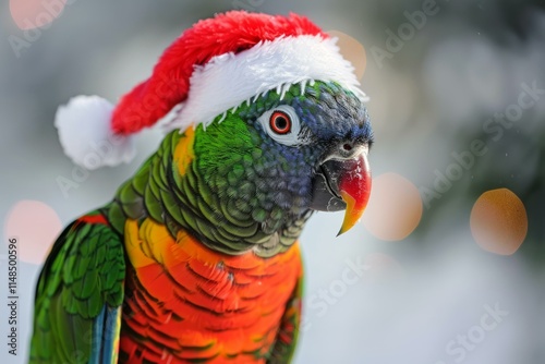 Colorful parrot wearing santa hat celebrating christmas holiday