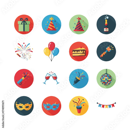 Colorful party elements arranged in circular buttons representing celebration and festive mood for birthday or special event.