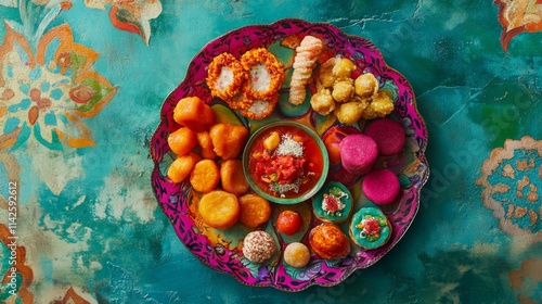 Colorful Plate of Traditional Desserts and Sweets on Vibrant Background