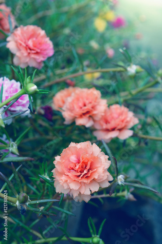 Colorful portulaca oleracea flower ( common purslane, verdolaga, pigweed, little hogweed, red root, pursley) blooming during summer.