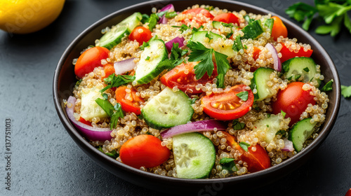 colorful quinoa salad bowl featuring cherry tomatoes, cucumbers, and fresh herbs