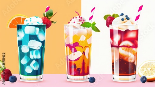 Colorful refreshing cocktails with fruits and ice in glass cups decorated with straws and fresh garnishes.