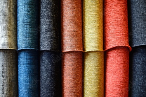 Colorful rolls of carpeting displayed in a store.