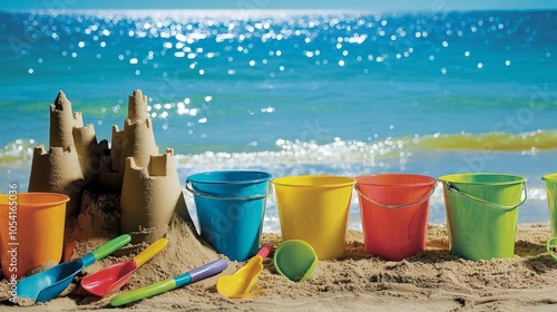 Colorful sand pails and shovels sit near a sandcastle on a sunny beach.