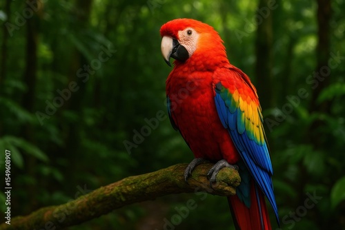 Colorful Scarlet Macaw perched in lush tropical rainforest