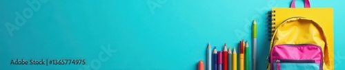 Colorful school backpack, stationery, blue backdrop Copy space , markers, supplies, backtoschool