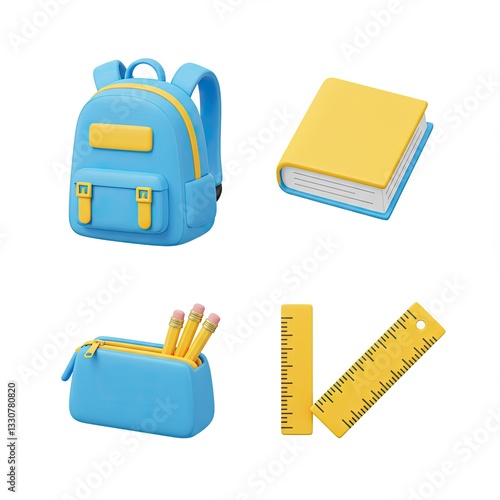 Colorful school supplies set featuring backpack, book, pencil case, and ruler in blue and yellow