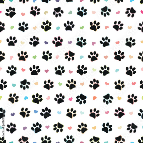 Colorful shining black paw prints seamless pattern