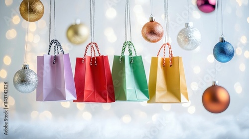 Colorful shopping bags falling with christmas tree on color background,holiday shopping online season,holiday winter shopping bags and gift boxes,space for text.