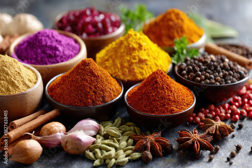 Colorful Spices and Herbs in Bowls on Dark Surface