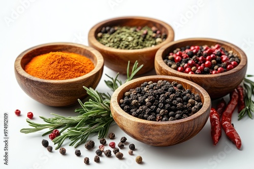 Colorful spices and herbs sitting in wooden bowls on white background