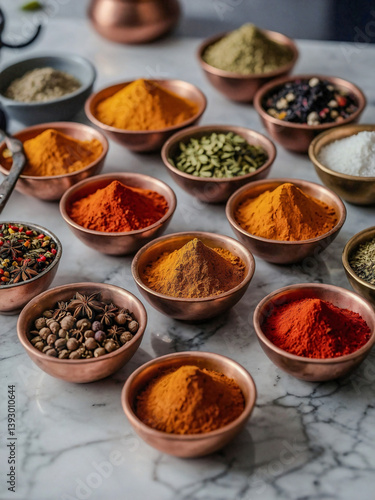 Colorful spices in copper cups on marble.