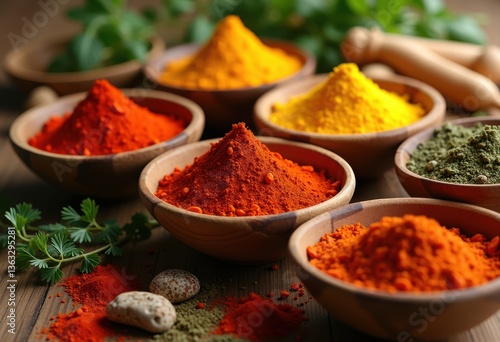 colorful spices wooden bowls arrangement bright natural seasoning ingredients culinary display, herb, powder, flavor, aroma, kitchen, cardamom, paprika