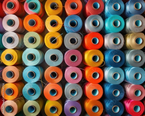 Colorful spools of sewing thread neatly arranged in rows, showcasing a vibrant array of hues. Textiles and crafting concept.