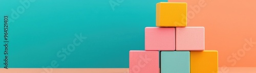Colorful stacked blocks against a vibrant blue and orange background, showcasing simplicity and playful design in a minimalist composition.