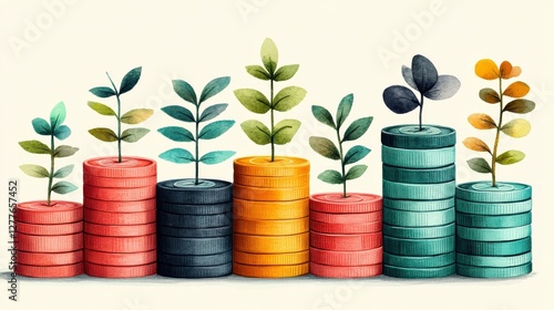 Colorful stacked coins with plants growing, symbolizing financial growth and sustainability