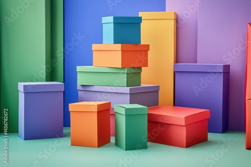 Colorful stacked gift boxes in vibrant shades create a playful and modern atmosphere.