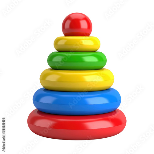 Colorful stacking toy composed of various sized rings arranged in a pyramid shape. cut out. transparent background