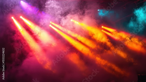 Colorful stage lights shining through thick smoke creating a vibrant and dramatic atmosphere