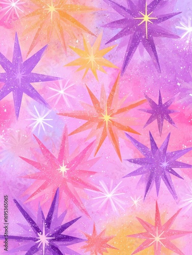 Colorful Starburst Patterns in Vibrant Shades of Pink, Purple, and Orange Fill the Background, Creating a Whimsical Atmosphere for Creativity