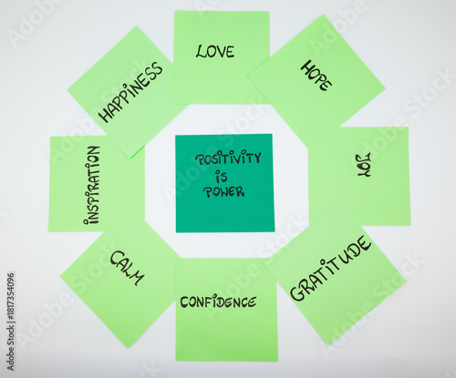 Colorful sticky notes arranged in a circle, representing positive emotions and well-being concepts. Ideal for wellness, psychology and self-care themes.