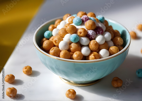 Colorful Struffoli in a blue bowl, featuring golden fried dough balls, white chocolate, and vibrant candied fruits.