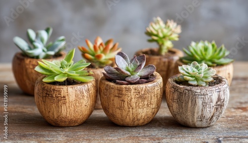 Colorful succulents in textured wooden pots on a rustic table.