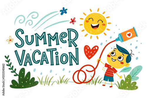 "Colorful Summer Vacation Illustration with Smiling Sun and Playful Boy"