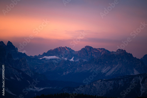 Colorful sunset in the Dolomite mountains at Passo Giau.