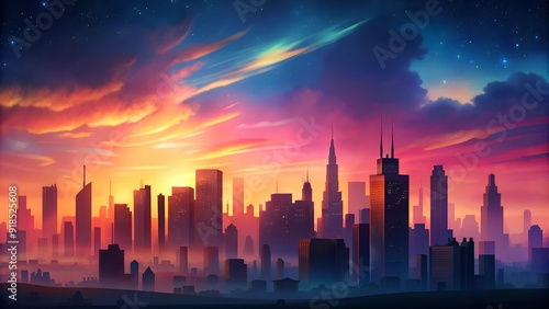 Colorful sunset over futuristic city skyline, vibrant urban landscape with glowing clouds