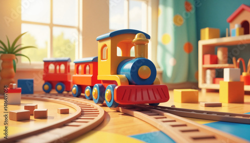 Colorful toy train on wooden tracks in bright playroom, childhood joy