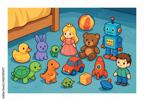 Colorful toys collection with robots, animals, and children on bedroom floor