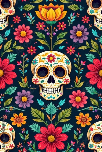Colorful traditional Mexican seamless pattern with flowers and skulls, decoration, fiesta, vibrant