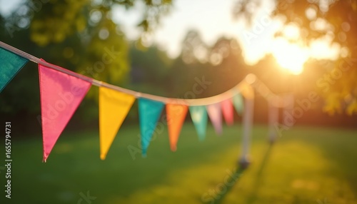 Colorful triangular pennant flags strung across grassy yard under warm sunlight. Festive, vibrant atmosphere suggests celebration, party, or outdoor gathering. Playful, cheerful mood.