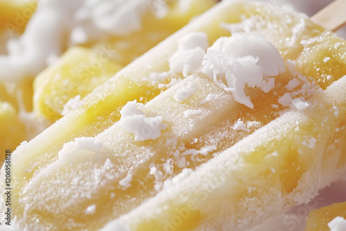 Colorful tropical popsicle displayed with coconut flakes against a bright backdrop in a sunny setting