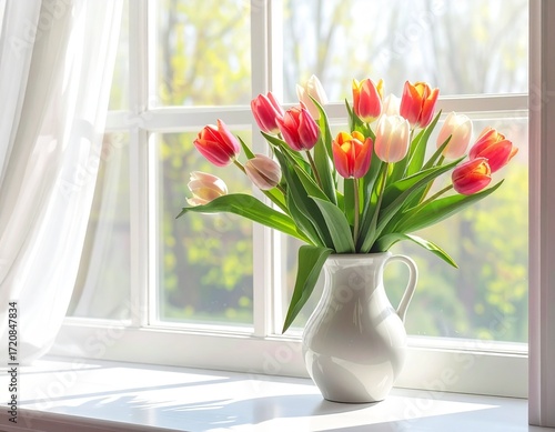 Colorful tulips in a white jug on a windowsill with sunlight streaming through, bringing a cheerful and vibrant spring mood to the interior.