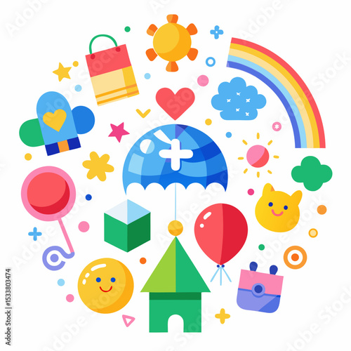 Colorful Universal Children’s Day Vector with Toys and Symbols on White Background
