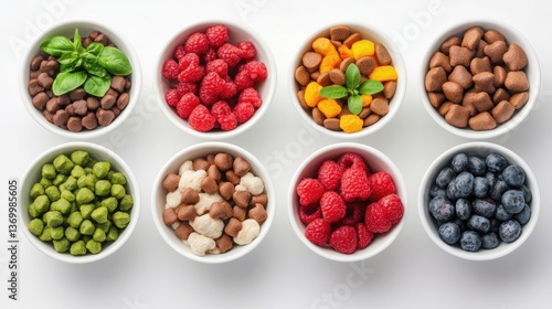 Colorful Variety of Fresh Fruits and Nuts in White Bowls Arrangement