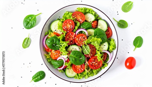 Colorful vegetable salad in a bowl on white surface, featuring cucumbers, cherry tomatoes, red onions, lettuce, spinach, and sesame seeds for a fresh and healthy presentation.