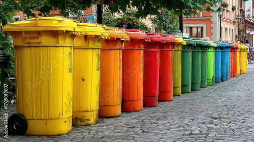 Colorful waste bins lined up on cobblestone street create vibrant scene, showcasing commitment to recycling and environmental awareness. bright colors add cheerful touch to urban landscape